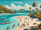 Beschreibung Ein langer, weißer Sandstrand mit kristallklarem Wasser und sanften Wellen.